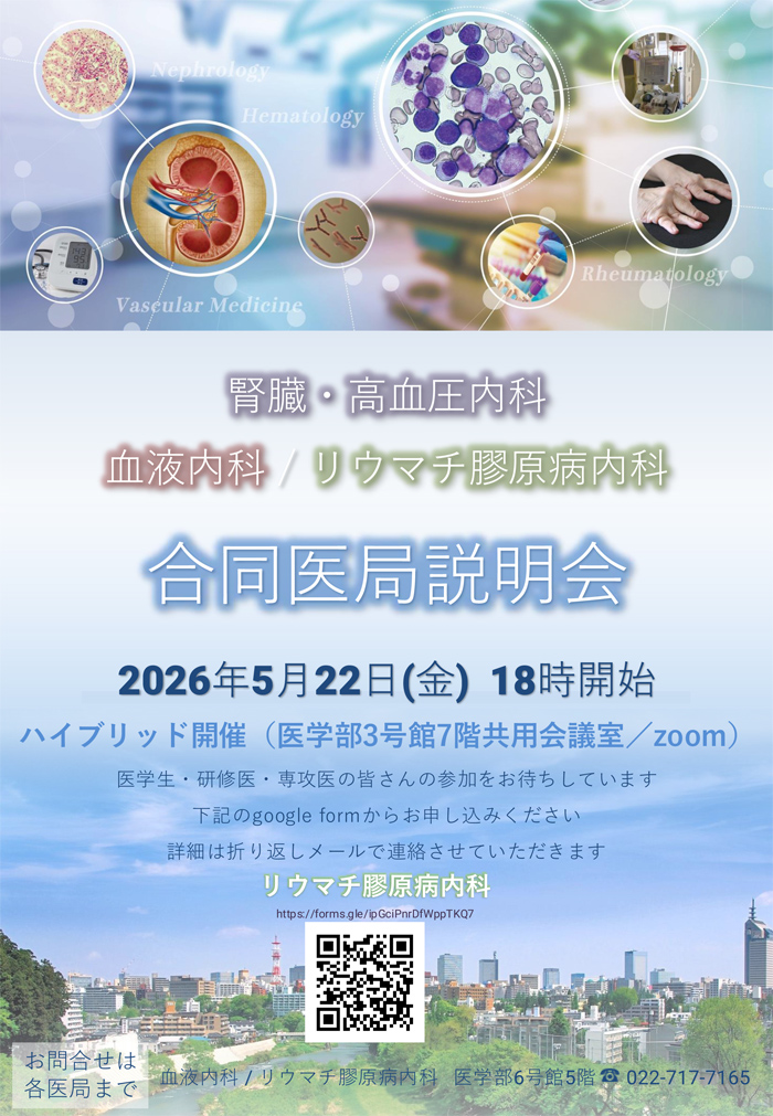 | 問い合わせ | 東北大学 血液内科・リウマチ膠原病内科 TEL:022-717-7165 Mail:rh-hisyo☆grp.tohoku.ac.jp(☆を@に変えてください) |